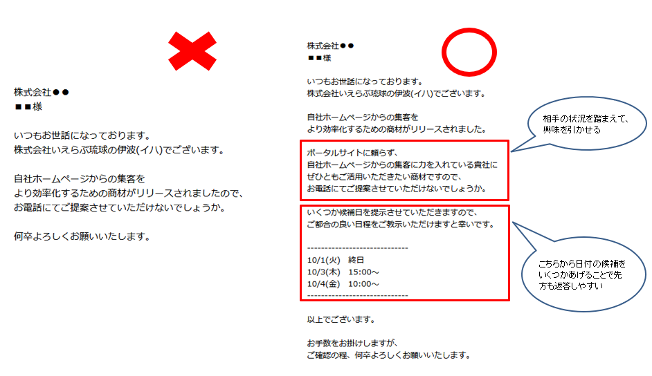 それとは対照的に例えば、自社ホームページからの集客に力をいれている会社様が「 自社ホームページからの集客に関するご提案 」という件名のメールを見たら速攻で開きたくなると思います。